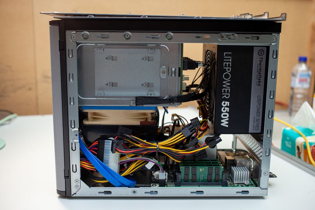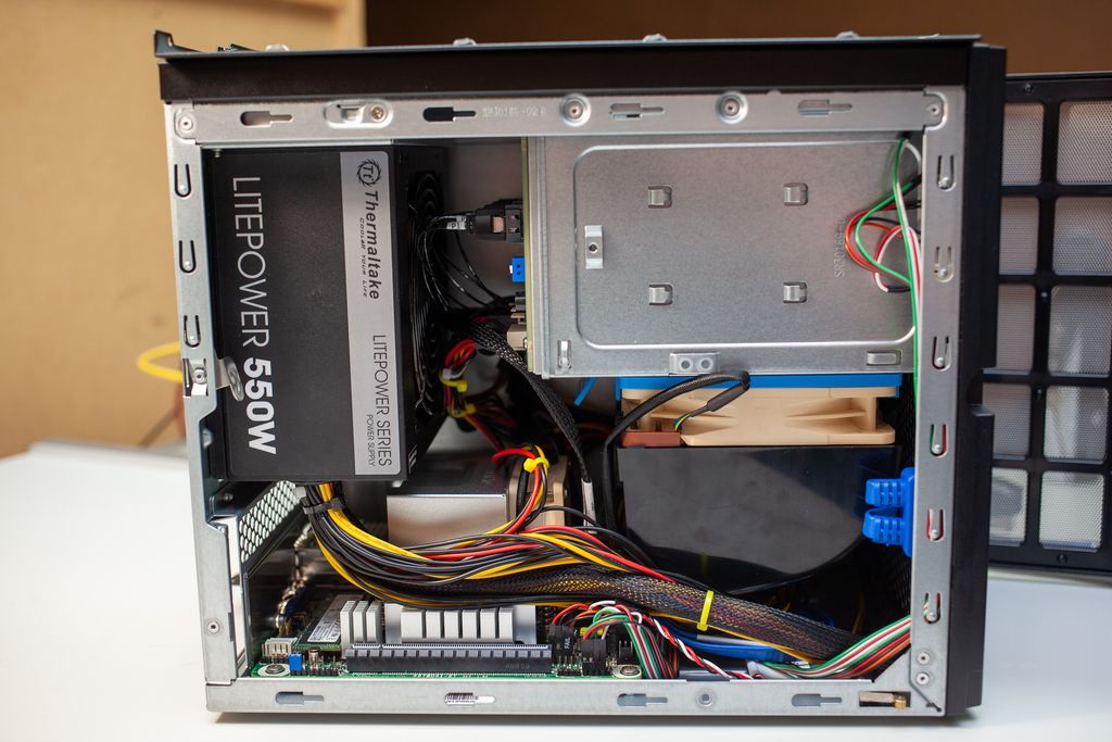 Cooling is performed by 3 Noctua fans, the CPU using a Dynatron K666R1 cooler (in case you decide to build one yourself, there isn't much that fits in this chassis) with a tiny 60x25mm fan, and a pair of 120x25mm fans in the chassis, the last one being installed inside the PSU, since the one built into it never actually turned on, it's power cable is routed through the same gland the PSU power cables exit and plugs into the MB, thus allowing novel BMC control of the PSU fans speed.
